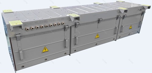 用于动车领域的大功率高频辅变产品(主辅一体),输入电压范围宽,过载能力强。相对工频辅变产品,小型化、高效化优势显著。功率模块的电气与水路采用快接方式,维护简单快速。